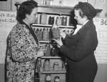 Palo Pinto County Livestock Association. Show and Rodeo. Mineral Wells. Mrs. Claud Bostick, left, and Mrs. J. A. Halley of Sterdevant, looking at canned products.