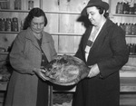 A scene from the Palo Pinto County Livestock Association Show and Rodeo, Mineral Wells. Mrs. W. T. Dunaway, left, of the Progress Club inspects a large ham with Miss Flora Currie of the Brad Club.