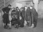 A group of soldiers of the 36th Division at Camp Bowie take a break from their housekeeping duties to listen to "New San Antonio Rose" on the Service Club jukebox. The jukebox is a Wurlitzer brand. The soldiers are wearing matching broom squad uniforms. Several of the men are holding brooms.