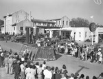 Shot of the float," The Truth Shall Make You Free," entry of Phi Gamma Delta Fraternity. The parade float holds college men posed as Greek statues and moves along a crowd-lined parade route in front of a Gulf gas station. Published in Fort Worth Star-Telegram, morning edition, April 7, 1941.