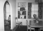 Dining room of the R. H. Beal home. In the room are a dining table, chairs, windows and curtains. Candles and plants are on the table. A globe is on the windowsill. A built-in cabinet is lined with books and china.