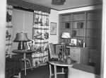 The den in the home of E. Gilbert Mason at Ridglea and Greenway Avenues. Furniture is of bleached mahogany. The carpet is red, and the wainscoting is of pine. In the den is a desk, two end tables, lamps, chairs and a mostly empty bookcase. On one of the tables is a framed, signed portrait of an unidentified man.