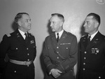 Thousands of civilians flocked to Camp Bowie and Camp Wolters to catch a glimpse of what the country is doing in way of national defense. Marching troops, social life, and field maneuvers made it a full day for the men in uniform and the visitors. The festivities at Camp Wolters in Mineral Wells, Texas concluded with a dinner at a downtown hotel. Pictured left to right are Colonel Fay W. Brabson, Lieutenant Colonel Otto F. Lange, and Lieutenant Colonel Archibald M. Mixson. They are standing against a wall, dressed in their military uniforms. Colonel Brabson is the executive officer of the infantry replacement center. Lieutenant Colonel Lange is the plans and training officer. Lieutenant Colonel Mixson is the commander of Camp Wolters' first battalion of selectees. Published in Fort Worth Star-Telegram, morning edition, April 8, 1941.