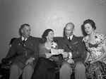 Donovan, Richard (Brig. Gen.); Donovan, Richard (Mrs.); Simpson, William Hood (Brig. Gen.); Simpson, William Hood (Mrs.); Military uniforms; Military officers; Dresses; Corsages; Celebrations; Dinner parties; Guests; Fort Wolters (Tex.); Armed Forces Day