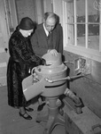 Thousands of civilians flocked to Camp Bowie and Camp Wolters to catch a glimpse of what the country is doing in way of national defense. Marching troops, social life, and field maneuvers made it a full day for the men in uniform and the visitors. Pictured at Camp Wolters in Mineral Wells, Texas are Reverend and Mrs. J. W. Cundiff. They are inspecting a potato peeler at the camp. Reverend Cundiff is the pastor of the Parker Street Baptist Church. He is dressed in a three piece suit. Mrs. Cundiff is wearing a fur coat. Published in Fort Worth Star-Telegram, morning edition, April 8, 1941.