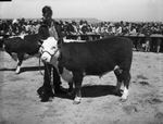 Gerald Buchanan and his 960-pound yearling that was grand champion of the Borden County 4-H Baby Beef Show at Gail, Texas. Gerald is standing beside his yearling, wearing a button-up shirt, jacket, trousers and a pair of glasses. Behind him are several spectators of the show standing behind a fence and looking on. There is also another calf behind Gerald, at the left. The yearling was sold at 16 cents a pound to the Snyder National Bank of Snyder, Texas.