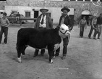 Jose Reyes, of Sierra Blanca, Texas, right, with his grand champion baby beef at the 1941 Southwestern Livestock Show at El Paso, Texas. Standing at the left, behind the calf, is Jess Moseley, who bred the calf. Both men are wearing cowboy hats, collared shirts, jackets and trousers. The baby beef has mostly dark hair and its face and underbelly are a lighter color. In the background are a few people walking around the stockyards.