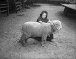 Barbara Wunsch, 4-H Club girl of Dona Ana County, New Mexico, with her prize winning ram lamb at the 1941 Southwestern Livestock Show at El Paso, Texas. Barbara is kneeling next to her lamb, holding onto its horns. She is wearing a dark, short-sleeve dress and boots. Behind her a fence and the bed of a truck can be seen. Barbara is the daughter of Mr. and Mrs. W. A. Wunsch, of State College, New Mexico, a state that allows girls to compete with boys in all feeding projects.