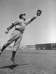 Ford Garrison, centerfielder for the Fort Worth Cats, leaping into the air to catch a baseball in his left hand glove. He is wearing a baseball uniform that includes a jersey that has, "Fort Worth," written across the front. He is also wearing a baseball cap. In the background the fence that surrounds the field can be seen, along with a few other players.