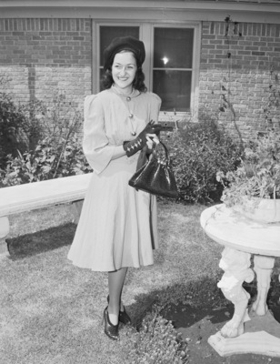 Miss Sylvia Bockstein, daughter of Mr. and Mrs. Harry Bockstein, will attend the University of Colorado. She is standing outside, wearing a dress, hat and gloves and holding a purse. Behind her is a bench, plants and a house.