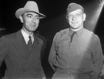 J. C. Deal, San Angelo Chamber of Commerce manager (left), greeting Major W. H. Papenfoth, commander of a searchlight battalion from Camp Hulen, as the convoy arrived in San Angelo, Texas, for training. The two men standing next to each other with their hands behind their back. Mr. Deal is wearing a striped, double-breasted suit with a striped tie and a brimmed hat. Major Papenfoth is wearing a military uniform and a small cap. He is also wearing eyeglasses.