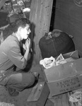 Soldier Alford Perreault shaving after arriving in Midland, Texas, with his battalion from Camp Hulen. Perreault is knelt down on the ground and has shaving cream all over his cheeks and chin. In front of him is a cardboard box filled with towels, a bottle of lotion and various other items. He is wearing a military uniform and is surrounded by several pieces of wooden planks. There is also a large bag of clothes set next to the cardboard box.