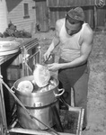 Private Zygmont Maszke, member of a searchlight battalion from Camp Hulen, inspects some ham steaks to be served to the soldiers upon arrival to Midland, Texas. Private Maszke is wearing a tank-top and military pants. He is using a barbecue fork to lift a ham steak out of the large pot, The large pot is set on top of the open door of the field kitchen oven. Behind him, a fence and part of a house can be seen.