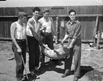 Four soldiers from a search battalion from Camp Hulen who found and caught a pig in the baseball grounds at Midland, Texas. They are gathered around the pig; two soldiers are holding either side of the pig while the other two men look on. The three men standing at the left are wearing tank-tops and dark trousers. The man on the right is wearing a military uniform with his sleeves rolled up. He is also smoking a cigarette. Behind the group is a wooden fence.