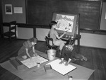Hellen Medley, seated left, Raymond Mitchell at the easel and Frank Sachez at right of Peter Smith School.