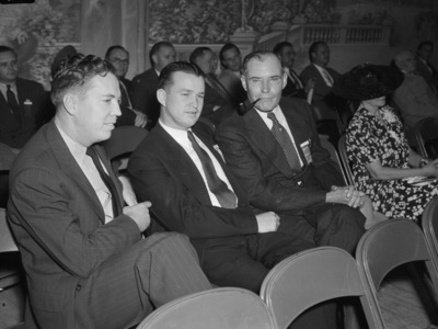 The Texas State Democratic Convention is getting under way in Mineral Wells, Texas. In attendance left to right are, Karl Lovelady, Marshall Formby and Lieutenant Governor Coke R. Stevenson. Mr. Lovelady, of Bosque County, Texas, is dressed in a double breasted pinstripe suit. Mr. Formby of Dickens County, Texas, is wearing a dark suit. Lieutenant Governor Stevenson is shown smoking a pipe. He is dressed in a pinstripe suit.
