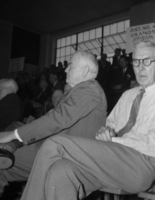 The Texas State Democratic Convention is getting under way in Mineral Wells, Texas. One of the familiar faces in attendance is State Senator W. A. Collins, of Livingston, Texas. He is watching his son, Hal H. Collins deliver the keynote address. Senator Collins is sitting with his leg crossed, dressed in a pinstripe suit. There is an unidentified man at the right.