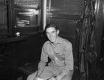 Herman Griffith, outfielder for the Worth Hotel amateur baseball team. Mr. Griffith is shown seated on a small bench in a room. He is wearing a jumpsuit and appears to be holding a small piece of paper. A dark jacket is hanging on the wall behind him. Beside him is a wooden counter and a window where a file cabinet can be seen.