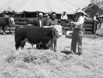 Auction of Hereford Cattle in the J. P. Osborne & son dispersion. Mr and Mrs. A. F. Hekit if Amarillo, Texas, shown with the bull they purchased.