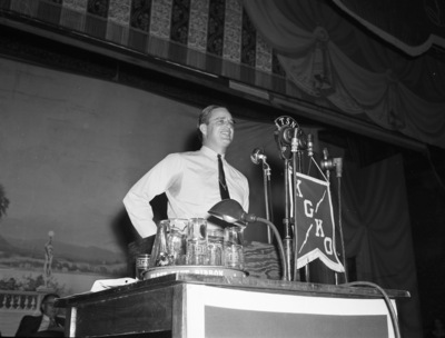 The Texas State Democratic Convention is getting under way in Mineral Wells, Texas. One of the familiar faces in attendance is Elliott Roosevelt, son of President Franklin D. Roosevelt. He is shown at the podium, replying to the keynote speaker. Mr. Roosevelt is wearing a dress shirt and necktie. There is a pitcher of water and glasses on the table. A KGKO banner is hanging in the background.