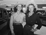 Stamford Rotarians traveled 247 miles and visited 16 towns last week, to invite West Texas attendance at the Texas Cowboy Reunion in Stamford Thursday, Friday and Saturday. Here are, left to right, Miss Charline Arendt, who has been chosen at Albany's sponsor, and Miss Betty Jane Blackwell, who is Miss Stamford. Miss Arendt is the daughter of Mr. and Mrs. Charlie Arendt. They are standing next to each other, wearing hats, shirts and trousers. Betty is wearing a watch on her left hand. There are automobiles in the background.
