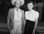 Stamford Rotarians traveled 247 miles and visited 16 towns last week, to invite West Texas attendance at the Texas Cowboy Reunion in Stamford Thursday, Friday and Saturday. Mrs. Lee Walker, official Stamford hostess, and Mrs. Charlie Grissom, the Haskell sponsor. They are standing next to each other. Mrs. Walker is wearing a coat and a hat. Mrs. Grissom is wearing a blouse and an empire-waist skirt and is sporting a wavy-hairstyle.