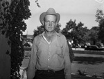 Winners in two and a runner-up in another of the popular contests held at the twelfth annual Texas Cowboy Reunion last weekend at Stamford. Here is Jeff Slocum of Cresson, Texas, named most typical cowboy under 55 years of age. He is wearing a shirt, trousers, a lapel pin with a chain and is posing for the camera.