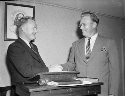 Attending the meeting for the Fort Worth Presbytery left to right, are Reverend Charles B. Brinkley and Reverend William A. Cockerell. Reverend Brinkley, pastor of the Files Valley Presbyterian Church. is presiding at the bi-annual meeting. He is dressed in a suit. Reverend Cockrell is the pastor of Oakhurst Presbyterian Church, who is hosting the meeting. He is wearing a suit with a pocket square.