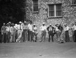 Crowd watching Byron Nelson putting. Gene Sarazen is leaning on his pitter while his partner, Tommy Armour, crouches behind him on the ninth green at the U. S. Golf Association Open tournament.