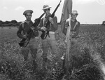 Engaged in a military training exercise are Private W. D. Morris, of Gilmer, Texas, right, Corporal Mack Williams, left, and Sergeant Horace Harpold, center, both of Dallas, Texas. All three are from the second battalion of the 144th Infantry, 36th Division. They are standing in the middle of a field, wearing their military uniforms. Sergeant Harpold is wearing sunglasses. He and Corporal Williams are holding rifles and Private Morris is carrying a large flag.