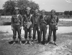 Some of the 142nd Infantry prisoners captured by a Red Army advance during a military training exercise at Camp Bowie. They are, left to right, Private Major Fitts, of Port Arthur, Texas, Private Roymond Harris, Private Ray Green, Private Wallace Richards and Private John White, all of Amarillo, Texas. They are from Company H, the Second Battalion's heavy weapons outfit. The men are standing outside, wearing their military uniforms.