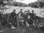 Some of the prisoners, all from Company F of the 142nd Infantry, who were captured during a military training exercise at Camp Bowie. They are, left to right, front row, A. Armendaiz, of Seguin, Texas, Wilbert Unnasch, of Thorndale, Texas, Sergeant Curtis Ellison, of Canyon, Texas, and Chester Rutledge, of Weatherford, Texas. On the second row are Ovlee Robertson, of Texas City, Texas, and Sergeant Orval Fehr, of Canyon, Texas. On the back row are Jack Smith, of Hondo, Texas, Corporal J. V. Langford, of Canyon, Texas, Corporal Riley W. Troth, of Canyon, Texas and Sergeant Warren Smith, of Canyon, Texas. The soldiers are outdoors, sitting in the middle of a field. They are wearing their Army uniforms.