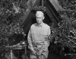 Major General George V. Strong, commander of the VIII Army Corps, who oversaw military training exercises at Camp Bowie. He is standing in front of a tent, wearing his military uniform and eyeglasses. An unidentified man is standing in the background, wearing a suit and a hat.