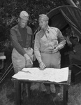 Major General William S. Key, left, commander of the 45th Division, pointing to a map on a table, and Colonel Kenneth Buchanan, of General Headquarters Staff, Washington, D. C., discussing a situation in the recent VIII Army Corps maneuvers at Camp Bowie. The officers are standing outside, wearing their military uniforms. Two unidentified men are sitting inside a tent in the background.