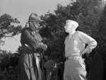 Lieutenant Colonel ((LIEUT. COL.)Thomas R. Kerschner, left, Third Army Assistant G-3 and executive director of the maneuvers, visited Major General (Maj. Gen.) George V. Strong at the latter's VIII Army Corps command post in the field. His command post (CP) was bombed in a Red air raid. The Blues later captured enemy planes that led them to believe they were confronted with a five-division force. Both men are shown standing outside, facing each other and engaged in conversation. Lieutenant Colonel Kerschner is standing with his arms folded and looking off into the distanced. He is wearing a raincoat and a hat. Major General Strong is wearing his uniform. His hands are resting on his waists. Published in the Fort Worth Star-Telegram morning edition, June 15, 1941.