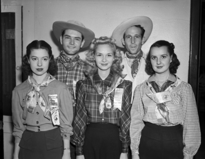 The spirit of the West is invading the Interstate Theaters where employees are wearing ranch style costumes. The outfits are a promotion for the upcoming premier of "The Westerner," starring Gary Cooper. The cowgirls are left to right, Tollie Taliaferro, Dorothy Nell Starns, and Dorothy Harrison. The cowboys are left to right, Leon Gardner and Ed Connor. Tollie is a cashier at the Hollywood Theater. She is wearing a sweater, bandanna and a skirt. Dorothy Nell, cashier at the Palace Theater, is dressed in a plaid blouse and a skirt. Dorothy Harrison, cashier at the Worth Theater, is wearing a checkered blouse, bandanna, and skirt. Leon, chief usher at the Worth Theater, is wearing a cowboy hat, bandanna, and a plaid shirt. Ed, doorman at the Hollywood Theater, is dressed in a cowboy hat, bandanna, and a button-up shirt.