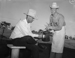 Stamford Cowboy Reunion. R. C. Kirkland, with the Spur outfit, is given some coffee by Lee Kelley, cook for the Spur Wagon. Kelly has been cooking for the SMS Ranch for 25 years. Kirkland is sitting with his legs crossed and is leaning forward with his coffee cups in his left hand. Kelly is wearing an apron and is leaning forward as well, pouring coffee from the kettle. Both men are wearing cowboy hats. Kelly is wearing eyeglasses.