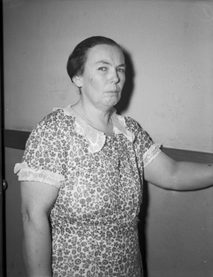 The Arlin F. Reese Murder Trial is being held in Groesbeck, Texas. Mr. Reese is being accused of murdering his girlfriend, Mrs. Lizzie Reinhardt. Relatives of Mr. Reese are attending the trial. Mrs. H. H. Chandler of Tiger Prairie, Texas, is the sister of Mr. Reese. She took her seat beside him in court for the beginning of the trial. She is wearing a floral print dress.