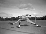 Fred Harris, first baseman for the Worth Hotel baseball team. Mr. Harris is shown in action as he swoops down to catch a baseball in his glove. His body is bent forward and his right arm is extended to catch the ball. He is wearing his team's uniform that reads, "Worth Hotel," on the jersey. In the background, two other men can be seen standing on the field.