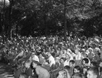 Droves of people came to the Forest Park Zoo, Sunday to see the trained animal show. Shown is the large crowd attending the show. Gilmore Fry's troupe of animal actors put on their show to goggle-eyed and delighted audiences. In the show are "Buck," the baboon, "David," the pigtail monkey, and "Woodrow Wilson," the spider monkey.