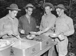 With the 124th Cavalry Regiment of the 56th (Texas) Brigade, on maneuvers in Louisiana. Mess time for Troop B finds Private W. L. Burkeen of Fort Worth, Texas with the gravy ladle and Private Thomas Cargill of Pampa, Texas putting steak in the mess kit of Private L. J. McWhorter of Wheeler, Texas while Private Alton N. Howard of Fort Worth, Texas awaits his turn.