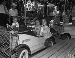 Exploring the Forest Park Zoo's carnival grounds are left to right twins Lanelle and Lounette Wyatt. They are the four year old daughters of Mr. and Mrs. W. W. Wright. The twins are riding in a small car wearing matching polka dot dresses. Lounette is eating a sack of popcorn. There are other children around them in cars and adults standing along the sidelines. Other carnival rides can be seen in the background.
