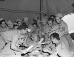 The mailman is the most popular fellow in camp among Texas soldiers engaged in the Louisiana maneuvers. First Sergeant Jack Guthrie, of Fort Worth, Texas, center, passing out mail to his men. Sergeant Guthrie belongs to Company I of the 111th Medical Regiment. The sergeant is sitting in the middle of a group of soldiers, handing out letters. Sergeant Guthrie's men are crowded around him, holding out their hands. In the middle of the scene is a wooden pole, there to hold up the tent the men are standing under. Everyone is dressed in military uniform. Published in the morning edition of the Fort Worth Star-Telegram on September 3, 1941.