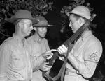 (Left to right) First Lieutenant John Steele, of Fort Worth, Texas, Oley Bryant, of Abilene, Texas, and Sergeant Pat Murphy, of Ballinger, Texas, Company C, examining a rifle. Lieutenant Steele and Bryant are standing in front of Sergeant Murphy, who is holding up the found rifle. All three are dressed in military uniform and are wearing brimmed hats.