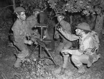 Soldiers studying an 81-millimeter mortar are (left to right) Corporal Elveridge Zimmerman, Private R. L. Jones, Corporal Virgil Laughlin and Sergeant Lloyd R. Fox, all of Stephenville, Texas. This 81-mm mortar uses projectiles manufactured in Fort Worth, Texas. The soldiers are knelt around the mortar as they inspect it. Each of them are dressed in military uniform and are wearing helmets. Corporal Zimmerman appears to be adjusting the mortar while Sergeant Fox hands a pair of binoculars to Corporal Laughlin.
