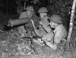 Group members operating a machine gun are (left to right) Sergeant J. P. Derrick, Sergeant Harry Stephens and Private John L. Stevens, all from Stephenville, Texas. The men are lying on the ground, gathered behind the gun. Sergeant Stephens is aiming the gun while Private Stevens is holding the gun's ammo sleeve. All three are wearing their military uniform and helmets. Around them are fallen leaves, branches and dirt.