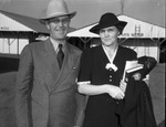 Mr. and Mrs. Bob Cross are producing registered Herefords on their ranch near Troup, Texas. The ranch belonged to Mr. Cross' father, the late Joe Cross. Many of the animals produced on the their ranch have been used as foundation breeding stock in East Texas and Louisiana. A bull from the Cross heard was champion Hereford at the Southwestern Exposition and Fat Stock Show a few years earlier. Mr. Cross is dressed in a cowboy hat and a double breasted suit. Mrs. Cross is wearing a hat and a button-up dress with a lace design on the sleeves and collar. She is carrying a jacket, book, newspaper, and her purse.