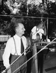 Image shows Gilmore Fry is the new monkey trainer at the Forest Park Zoo. He and his little animal family moved in last week. His household consists of a spider monkey, a pigtail monkey, and a nervous baboon. Mr. Fry and his animals put on a show every afternoon. He is a Texas barn farm boy and has been showing animals for forty years. He worked in three circuses, twenty state fairs, six carnivals, 500 schools, and one other zoo. Mr. Fry is wearing a dress shirt, necktie, trousers, and suspenders. He is standing beside a monkey in the monkey house. Published in the Fort Worth Star-Telegram morning edition August 11, 1941.