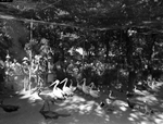 Image shows Droves of people came to the Forest Park Zoo, to see the trained animal show. Shown is the large crowd attending the show. They are gathered around a cage that has an assortment of birds in it . Published in the Fort Worth Star-Telegram morning edition August 11, 1941.