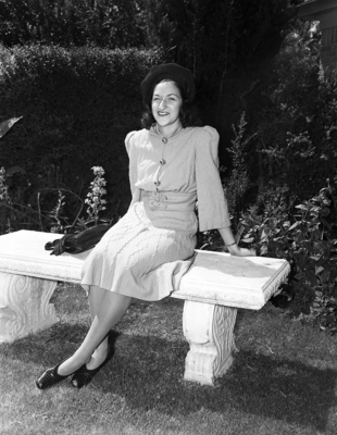 Miss Sylvia Bockstein, daughter of Mr. and Mrs. Harry Bockstein, will attend the University of Colorado. She is standing outside, wearing a dress, hat and gloves and holding a purse. Behind her is a bench, plants and a house. Published in the Fort Worth Star-Telegram morning edition September 12, 1940.